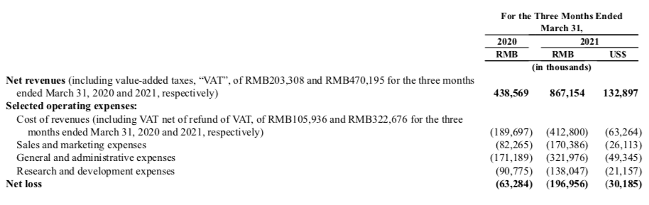 不过从招股书看,其收入在今年的增长加速。截止2020年3月31日和2021年3月31日,分别录得净收入4.386亿元、8.672亿元。这其中,货运经济服务收入从截止2020年3月31日的1.892亿元增长135.9%到2021年同期的4.464亿元。货运挂单服务收入从2020年3月31日的1.135亿元增长43.9%到2021年同期的1.633亿元,主要是来自会员费增长。开始从2020年8月收取某些运输订单的佣金实现交易服务货币化,在2021年3月31日的3个月中,交易佣金达到8550万元。增值服务收入,其中信贷解决方案占据主体,从2020年的3月31日的1.359亿元增长26.5%到2021年同期的1.720亿元。但仍处于亏损状态,截止2021年3月31日3个月,净亏损1.97亿元,而2020年同期净亏损6330万元。根据招股书可以看到,满帮正处于线上货币化早期阶段,收入主要来自于货主的会员费,卡车司机和其他生态系统参与者的利息和费用。