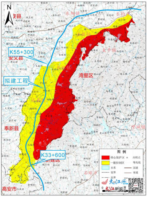 项目K33+600~K55+600(K45+300=K45+000,短链300m)约21.7km路段穿越安义西山岭县级自然保护区一般控制区;
