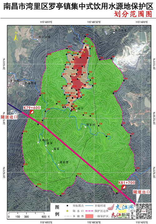 K79+600~K81+700约2.1km路段以隧道的形式穿越湾里罗亭镇罗亭水库饮用水水源二级保护区陆域;