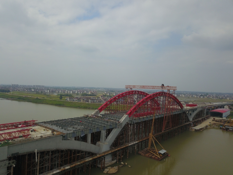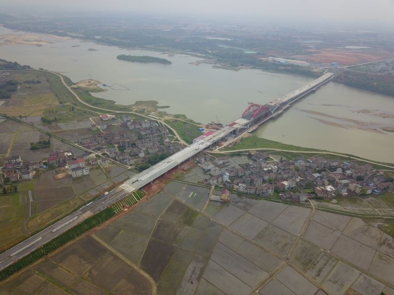 据悉,王安石抚河特大桥跨抚河而建,是我省高速公路项目建设的第一座飞燕式钢混组合系杆拱桥。全长1417米,主桥采用60m+168m+60m自平衡“飞燕”式中承钢管混凝土系杆拱桥,为双向6车道,设计时速80公里/小时。该特大桥主孔跨径大、逻辑工序多,技术难度高,承台、拱座、拱肋设计均为大体积混凝土。自开工建设以来,承建公司江西交投集团交工建设公司高度重视创新创优、提质提效,成立了创新创优工作室,将专利、工法、QC成果等科技创新贯穿于项目建设全过程。先后攻克了新型整体化钢桥面板的装配式钢栈桥施工技术、大型龙门吊吊装叠合梁钢管混凝土拱桥施工技术、大体积混凝土温度裂缝控制施工技术等科技攻关难题,大大提高了施工进度,提升了工程质量,为抚州东外环高速公路全线贯通奠定坚实基础。