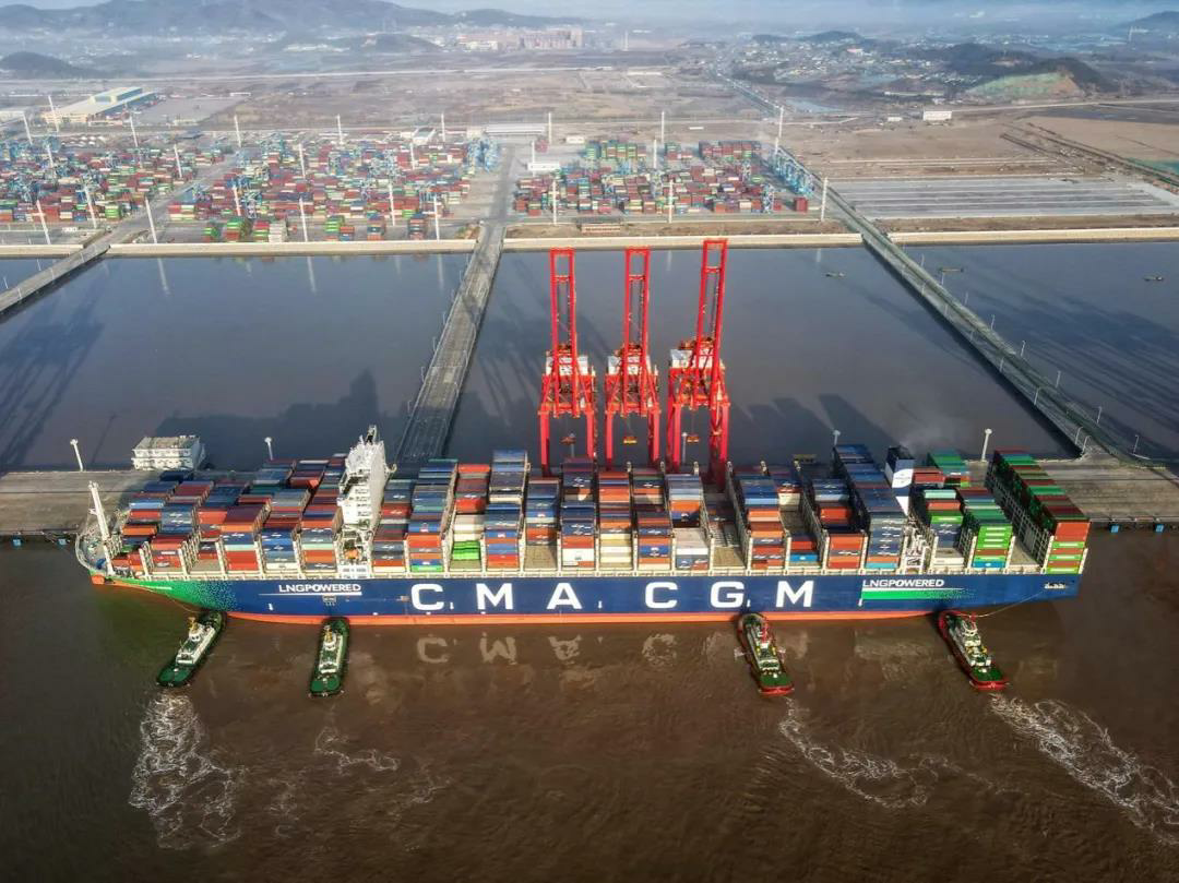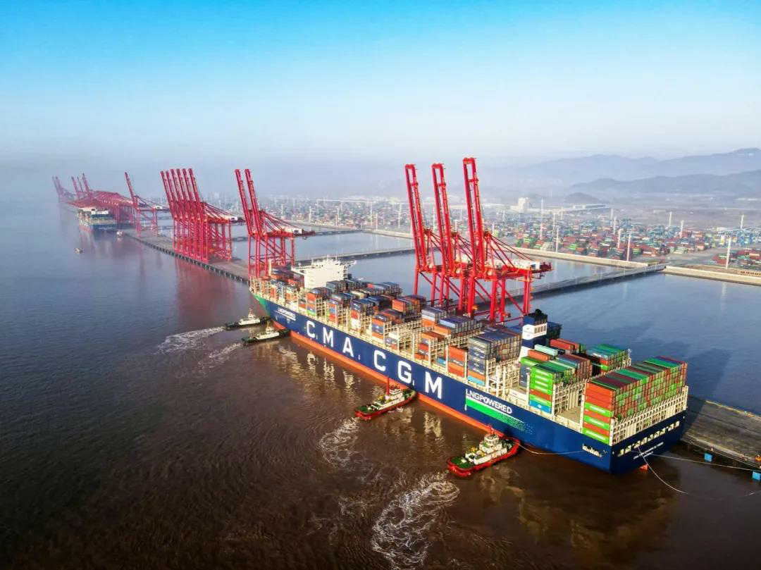 近日,载箱量达2.3万标准箱的全球最大液化天然气(LNG)动力集装箱船“达飞香榭丽舍大道”轮,在2名高级别引航员的引领下稳稳地靠上了宁波舟山港梅东集装箱码头有限公司(以下简称“梅东公司”)7号泊位。这是梅东公司首次接靠该轮,标志着该公司已具备挂靠全球最大LNG动力集装箱船的作业能力。