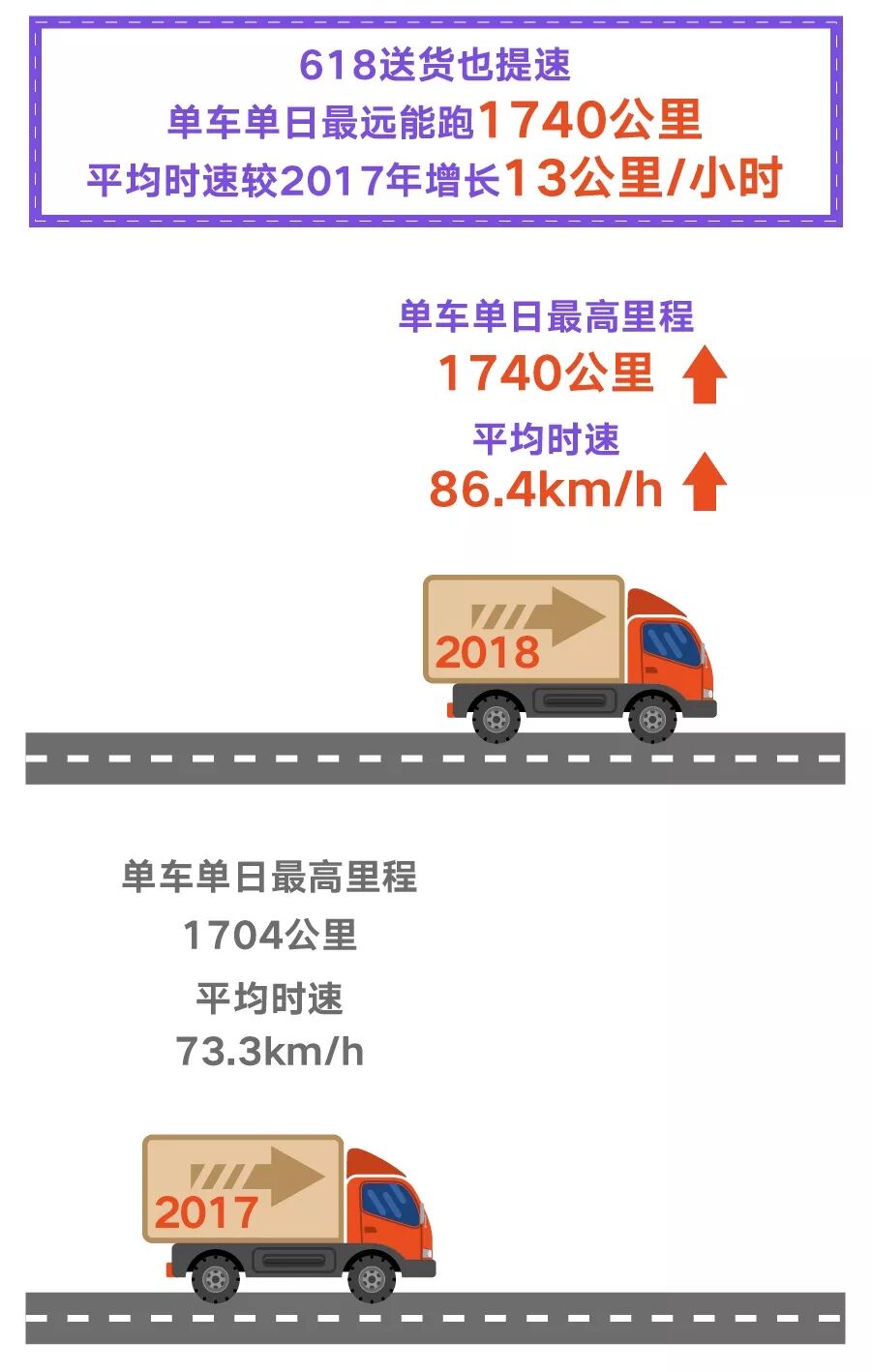 除此10个省份以外,以京东平台为例,在此次全球年中购物节中,西藏、云南、青海下单额增长最为强劲,消费聚焦于手机、大家电和服装。电商的优质产品及服务起到拉平地域间消费鸿沟的作用,人们的购物热情从大城市蔓延向城镇乡村,四到六线城市消费增长尤其迅猛,与大城市购买力间的距离在逐年缩小。 此外,618期间最繁忙10条电商物流线路所连接的城市,除了“北上广深”,还包括天津、苏州、西安、东莞、无锡5个“新一线”城市。足见这些城市商贸流通的活力和消费前景。 从G7平台的数据我们可以看出,这10条最繁忙的电商物流线路平均耗时仅为4个小时,可以看出在各大电商平台大力推进“短链”的今天,通过仓配一体的服务不断缩短商品与消费者之间的距离。以京东物流为例,今年618期间,其开放业务仓配一体订单量同比增长约200%。 从G7平台的数据我们也发现,今年618期间单车单日行驶里程以及平均时速较2017年都有了明显的提升。这在一定程度上说明,随着物联网、AI、大数据等前沿技术的介入,各大物流公司从传统的运营模式向智能化模式转变,对车辆运营效率的提升起到了明显的推动作用。 订单量的激增,运力的增长也带动了今年618期间电商物流总体油耗的增长,G7平台的数据显示,今年618期间总油耗相比2017年增长了51%。电商行业高速增长的同时,物流行业对能源的消耗也会飞速增长。 相信在不久的将来,新能源、自动驾驶等技术的发展将会成为绿色物流发展的重要“引擎”,G7也关注到了这一趋势,并在今年4月开始布局研发基于新能源的自动驾驶卡车技术,未来将会持续借助科技的力量推动中国智慧物流的发展。