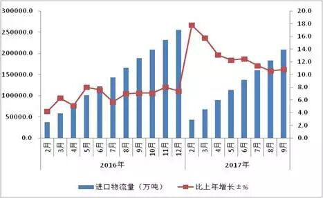 ---进口物流需求量稳中有升。在需求回暖、大宗商品价格回升及等因素带动下,前三季度国际物流需求稳中有升。1-9月进口物流总额7.2万亿元,同比增长10.8%,增速比上年提高3.7个百分点,年内预计可保持10%左右的增长。
