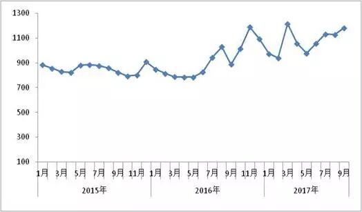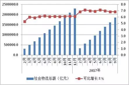 从外部环境来看,发达国家经济复苏态势仍在持续,新兴经济体保持增长,全球制造业和国际贸易回暖。10月份,国际货币基金组织预测全球经济增长3.6%,比4月份预测值上调0.2个百分点,比2016年加快0.4个百分点。在外部需求的带动下,我国出口形势有所好转。1-9月制造业新出口订单指数均值50.9%,较去年同期上升1.9个百分点。9月,新出口订单指数经历连续两月回落后反弹回升,较上月上升0.9个百分点,达到51%以上。表明三季度外部需求在波动中趋稳。预期随着一带一路战略的逐步推进,外贸形势具备继续回稳向好的基础,进而带动相关物流需求的增长。