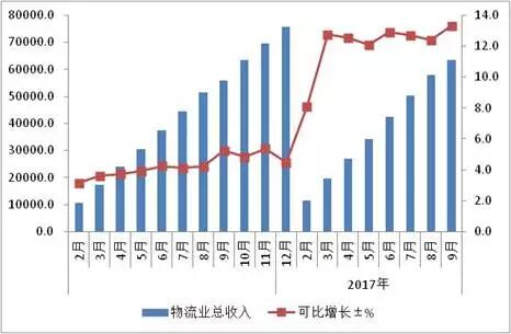 物流业转型升级态势明显,供给体系的质量和效率稳步提升,部分重点细分领域加速发展。在互联网+、消费升级的带动下,相关的邮政快递物流收入同比增长超过20%,增速比上半年提高0.4个百分点;随着食品安全受到关注,冷链物流市场收入同比增长在9%左右。