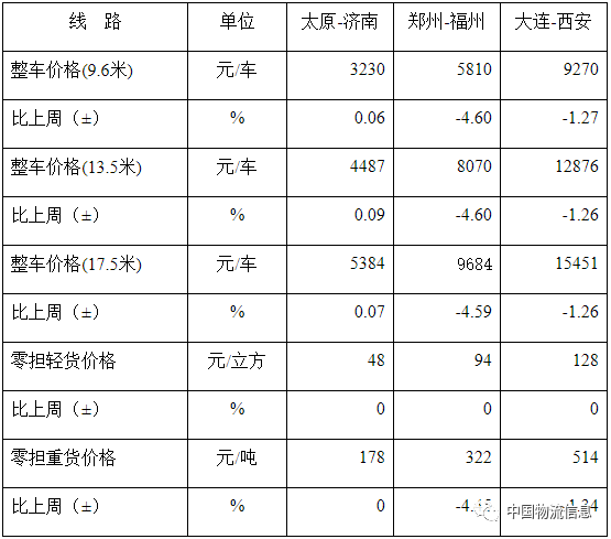 分车型看,各车型指数环比涨跌互现。其中,整车指数为1004.50点,比上周回落0.08%;零担轻货指数为981.22点,与上周持平;零担重货指数为1004.04点,比上周回落0.06%。