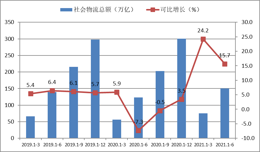 2021年上半年物流运行稳步复苏,主要总量指标高于疫情之前水平。社会物流总需求趋稳,上半年社会物流总额150.9万亿元,可比增长15.7%,其中工业和居民消费物流需求压舱石作用继续巩固,进口物流实物量保持增势,物流市场规模继续扩大。
