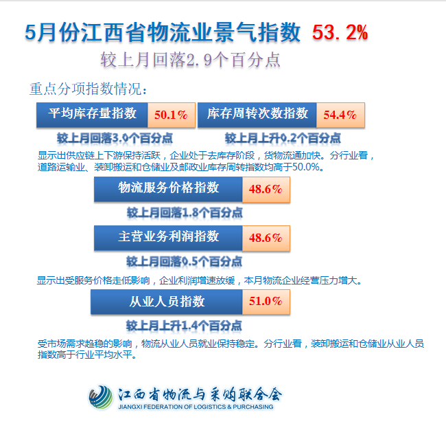 01 NEWS 业务总量和新订单指数回落, 物流需求增势减弱。 5月份,业务总量指数为53.2%,较上个月回落2.9个百分点;新订单指数为50.5%,较上月回落1.7个百分点。业务总量指数和新订单指数均有所回落,但仍保持在扩张区间运行,显示出全省物流业需求增速放缓,业务规模有所缩减。从细分领域看,快消品、电子设备、汽车均高于行业平均水平。 02 NEWS 平均库存量指数回落, 库存周转指数上升。 5月份,平均库存量指数回落3.0个百分点,为50.1%;库存周转次数指数上升0.2个百分点,为54.4%。显示出供应链上下游保持活跃,企业处于去库存阶段,货物流通加快。分行业看,道路运输业、装卸搬运和仓储业及邮政业库存周转指数均高于50.0%。 03 NEWS 物流服务价格指数, 整体水平依然偏低。 5月份,物流服务价格指数为48.6%,较上月回落1.8个百分点,突破50%的荣枯线;受物流服务平均价格下滑影响,主营业务利润指数比上月减少0.5个百分点,为48.6%,依然处于缩减区间。显示出受服务价格走低影响,企业利润增速放缓,本月物流企业经营压力增大。 04 NEWS 从业人员就业情况稳定向好。 5月份,从业人员指数为51.0%,较上月上升1.4个百分点,显示出受市场需求趋稳的影响,物流从业人员就业保持稳定。分行业看,装卸搬运和仓储业从业人员指数高于行业平均水平。