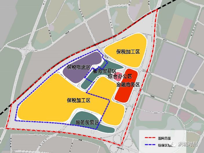 综保配套区:主要发展商业配套、工业生产功能生活服务配套,在综保大街两侧,建设名品加折扣模式的奥特莱斯购物广场以及游乐休闲设施,打造多业态综合、一站式和体验式商业消费中心。