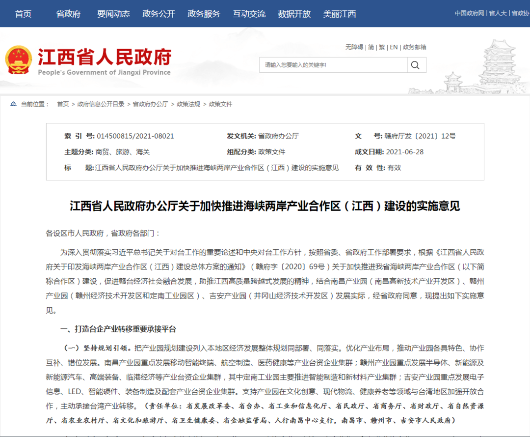 将合作区建设列为工作重点 刘奇书记、易炼红省长 先后对合作区建设提出要求 一起来看看 打造台企产业转移重要承接平台,包括坚持规划引领、瞄准承接重点、强化项目支撑、推动集群发展; 打造助推转型发展重要创新平台,包括加快科技创新、提升承载能力、打造绿色园区、用活引导基金; 打造国家政策倾斜重要对接平台,包括深化省部合作、落实税收政策、做好用地保障; 打造台青创业交流重要示范平台,包括加大资金支持、做好创业孵化、加强招才引智; 优化开放法治营商环境,包括强化政务服务、做好金融服务、优化海关监管、扩大对外贸易、拓展内需市场; 建立常态长效工作机制,包括完善招商机制、强化协同合作、发挥示范效应、推行动态管理。 打造“四个平台”。 南昌产业园重点发展移动智能终端、航空制造、医药健康等产业集群; 赣州产业园重点发展半导体、新能源及新能源汽车、高端装备、临港经济等台资产业集群,其中定南工业园主要推进智能制造和新材料台资产业集群; 吉安产业园重点发展电子信息、LED、智能硬件、装备制造及配套等台资产业集群。 支持产业园在文化创意、现代物流、健康养老等领域与台湾地区加强开放合作,主动承接台湾产业转移。 用好国家支持原中央苏区振兴发展政策 比如,对设在赣州市的鼓励类产业的台资企业,按规定减按15%税率征收企业所得税。 强化对重大台资项目支持 注重吸引台籍人才 比如,对合作区重点产业发展能够产生重大影响的台湾一流或顶尖人才团队的引进,实行"特事特办、一人一策"。 助力科技创新 比如,支持台企申报各类研发计划,落实制造业台企研发费用按照实际发生额的 100%、其他符合条件的台企研发费用按照实际发生额的75%在税前加计扣除等政策。对首次入选的江西省独角兽企业、潜在独角兽企业、种子独角兽企业、瞪羚企业、潜在瞪羚企业分别给予400万元人民币、150万元人民币、100万元人民币、20万元人民币、10万元人民币的一次性奖励用于科技创新活动。 支持台企拓展对外贸易 比如,支持台企采用江西开行的铁海联运、赣欧班列、水水联运承运进出口货物,享受口岸"三同"政策。 维护台商台企权益 比如,对台企因国家利益、公共利益或其他法定事由需要改变政府承诺和合同约定而受到的损失,依法予以补偿。 加大青创支持倾斜 比如,对台湾青年就业创业成效突出的产业园给予适当奖励;符合条件的台籍自主创业人员可申请20万至600万元不等的创业担保贷款,并按财政规定给予贴息,吸引更多台湾青年来赣创业发展。 突出服务高效实效 比如,落实好政务服务"好差评"、帮办代办导办、延时错时预约服务等制度,全面实施公平竞争审查制度、市场准入负面清单制度、外商投资准入前国民待遇加负面清单管理制度。落实上市奖励政策,对符合条件的台企上市公司,按规定给予上市奖励。对合作区内出口台企正常出口退税在平均7个工作日内办结。 建立协调督促机制 比如,为加强合作区的统一指导与协调,建立联席会议制度和重点工作调度机制。又如,实施绩效管理考核,各产业园两年内新入驻台资项目不少于5个。 来源:江西省人民政府