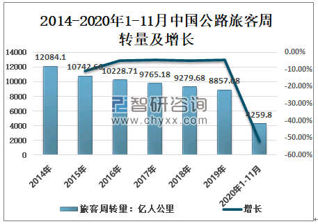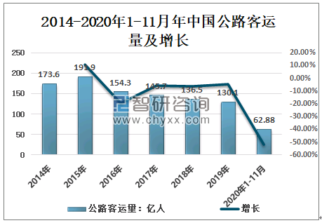 智研咨询发布的《2021-2027年中国公路运输产业发展态势及投资决策建议报告》显示:近年来,随着居民私家车更加普及,高铁、民航运输迅速发展,公路运输客运量呈下降趋势,2019年中国公路客运量130.1亿人,比上年减少6.4亿人;2020年因疫情的影响,公路运输客运量下降更明显,到1-11月年中国公路客运量只有62.88亿人,不到2019年全年的一半。