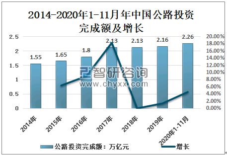 公路运输在我国社会经济中扮演着重要角色,已经成为了当前最为主要的交通形式。近年来,中国公路建设投资额增长平稳,我国公路建设投资额呈不断上升趋势,2019年中国公路投资完成额2.16万亿元,比上年增加0.03万亿元;2020年1-11月中国公路投资完成额2.26万亿元。