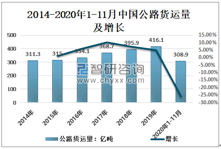 公路运输作为我国客货运量占比最大的运输方式,货物运输逐渐加快,公路货运量也是逐年平稳增加。2019年中国公路货运量416.1亿吨,比上年增加20.2亿吨;2020年1-11月,中国公路货运量308.9亿吨。