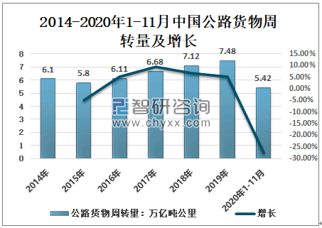 从货物周转量来看,中国公路货物周转量同货物运输量一样,也是呈增长趋势,2020年1-11月中国公路货物周转量5.42万亿吨公里。
