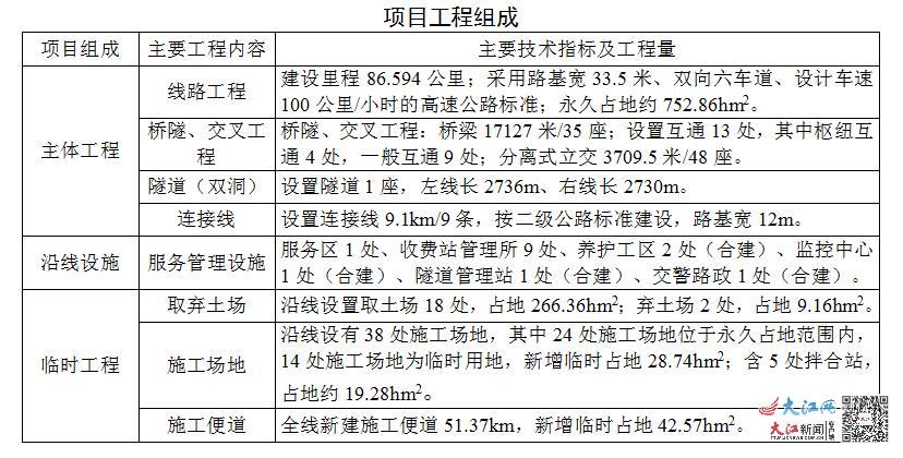 本项目拟于2020年12月开工,2023年12月底竣工,建设期3年。项目推荐方案总投资153.5亿元,环保投资10348.9万元,环保投资占整个项目工程投资的比例为0.7%。本项目工程组成包括主体工程、沿线服务管理设施、临时工程(取、弃土场、施工场地等)。