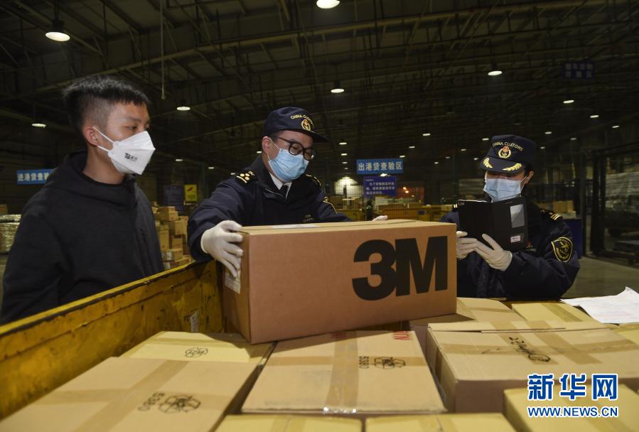 抗击新冠疫情期间,成都海关关员在双流机场口岸查验防护物资,做到即到即提,实现疫情物资通关“零延时”(1月30日摄)。新华社记者 刘坤 摄