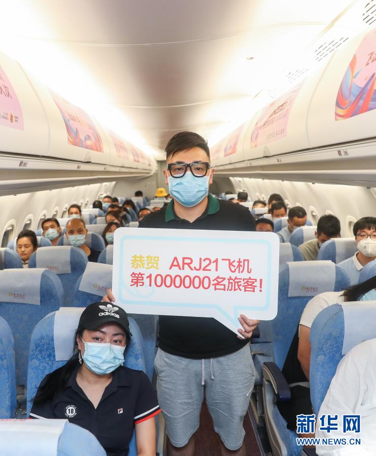 7月20日晚,ARJ21飞机的第100万名乘客在机舱内拍照留念。该架飞机从上饶三清山机场起飞,在成都双流机场降落。新华社记者 丁汀 摄