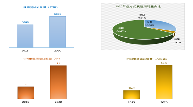 江苏省坚持以推进大宗货物运输“公转铁、公转水”为主攻方向,不断完善综合运输网络,扎实推进运输结构调整。铁路货物发送量从“十二五”末的5066万吨增长到2020年的6866万吨,增长35.5%;沿海主要港口大宗货物铁路和水路集疏港比例提升至94.2%,公路运输量减少超过1900万吨,水路货运周转量占比63.2%,居全国前列;内河集装箱港口达11个、运输量达65.5万标箱,分别是2015年的2.75倍和3.87倍;全省甩挂运输蓬勃发展,培育85家无车承运试点网络货运平台。