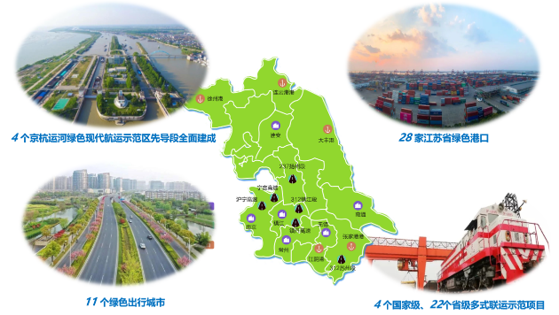 江苏省建成一批绿色生态航段,京杭运河湖西航道、施桥船闸等被评为“最美运河地标”;苏州、扬州、淮安四个京杭运河绿色现代航运示范区先导段全面建成;评选出28家江苏省绿色港口;南京禄口机场T2航站楼获得全国“三星级绿色建筑运行标识”,是全国首个绿色运行机场;国家级、省级多式联运示范项目分别达到4个、22个,开通示范线路116条,居全国首位。