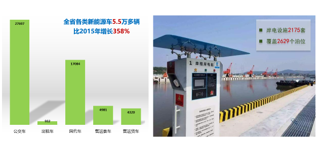 2020年,江苏省推广应用新能源营运车辆5.5万辆、清洁能源营运车辆7.5万辆,比2015年分别增长358%、5.6%。完成24艘LNG动力船舶建造和68艘大吨位船舶LNG动力更新改造。沿海、沿江及内河主要港口、船闸及水上服务区基本具备岸电供应能力。