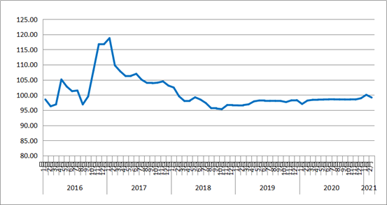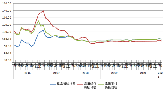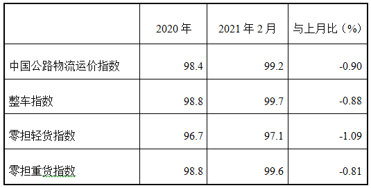 2021年2月份,由中国物流与采购联合会和林安物流集团联合调查的中国公路物流运价指数为99.2点,比上月回落0.9%,比去年同期增长1%。从各周指数看,第一、二、三周运价指数环比回落,第四周运价指数环比回升。