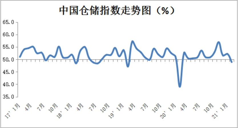 中国物流与采购联合会发布的2021年2月份中国物流业景气指数为49.8%,较上月回落4.6个百分点;中国仓储指数为48.9%,较上月回落3.3个百分点。