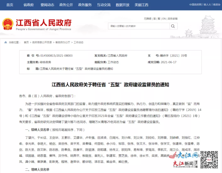 大江网/大江新闻客户端讯(黄思农)报道:2021年6月,江西省政府发布关于聘任“五型”政府建设监督员的通知,并公布了聘用人员名单。