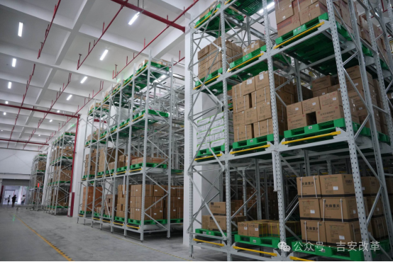 三是降本增效,拉长“产业协同链”。平台整合“降成本”。引进云速供应链平台,全面整合县域30余家企业运输需求,实行“拼车运输、干线直发”,降低运输成本。云仓赋能“提效率”。建成“共享云仓”,设置4800余个货位,集成智能分拣、订单自动匹配等功能,单箱运输时效缩短30%。统仓共配“强协同”。组建峡江承达供应链有限公司,整合5家快递企业资源,建成县级智能分拣中心,配置2台自动化设备,实行“统一分拣、统一配送、统一管理”,日均处理快递超2.5万件,节省人力成本约20%。