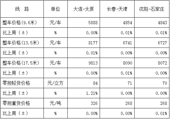 各车型指数总体平稳,其中整车指数基本持平,零担指数则环比回升。整车指数为983.25点,与上周基本持平。在零担指数中,零担轻货指数明显回升。零担轻货指数为1026.92点,环比回升0.51%;零担重货指数为982.28点,环比回升0.01%。