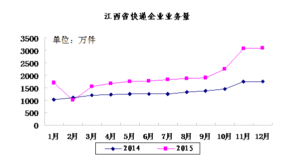 1.快递业务量。2015年,全省快递服务企业业务量累计完成23471.76万件,同比增长46.76%,全国排第16位。快递业务量排名前五位的市依次是南昌、赣州、上饶、九江和景德镇,其快递业务量合计占全省快递业务量的77.48%。南昌市快递业务量实现 10646万件,在全国快递业务量前50个城市中列第40位。