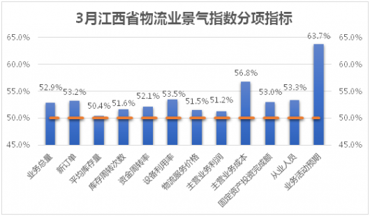 2019年4月3日 3月份,江西省物流业景气指数(LPI)为52.9%,比上个月回升4.3个百分点,12个分项指数中“11升1降”, 反映出随着供应链上下游经营活动的复苏,生产建设步入常态运行轨道...