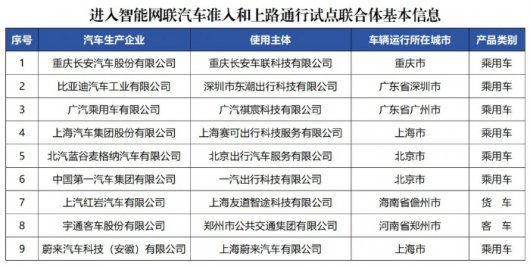 工业和信息化部等四部门近日发布,我国首批确定由9个汽车生产企业和9个使用主体组成的联合体,将在北京、上海、广州等7个城市展开智能网联汽车准入和上路通行试点,试点产品涵...