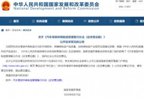 国家发展改革委会同交通运输部、商务部、海关总署、市场监管总局、生态环境部等部门组织起草了《汽车零部件再制造管理暂行办法(征求意见稿)》(以下简称《办法》),向社会公开征...
