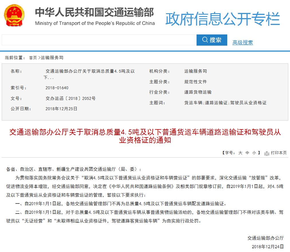 根据交通运输部办公厅2018年12月24日发布的《关于取消总质量4.5吨及以下普通货运车辆道路运输证和驾驶员从业资格证的通知》,自2019年1月1日起,各地交通运输管理部门不再为总质量...