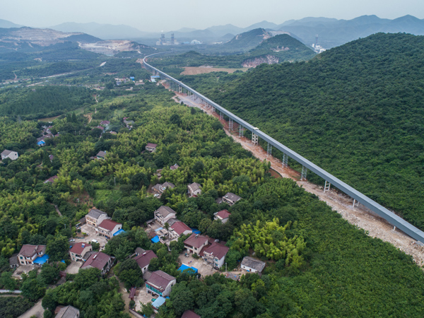 ▲ 空中俯瞰全封闭输送带(6月5日无人机拍摄)。 近日,位于浙江省长兴县内的22公里的全封闭、纯电动输送长廊进入最后的输送带封装及电动机调试阶段,计划于6月末试运行,该纯电动输送...