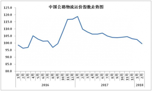 由中国物流与采购联合会和林安物流集团联合调查的中国公路物流运价指数2018年2月为99.6点,比上月回落2.8%,连续三个月回落。 图1 2016年以来各月中国公路物流运价指数 从月内各周指...