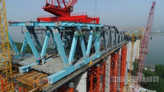 本网讯 5月26日上午10时,蒙华铁路控制性工程——三门峡黄河公铁两用大桥钢桁梁首推段顶推成功。该桥建成后,将创造桥梁顶推长度最长、重量最大两项世界纪录。 蒙华铁路三门峡黄...