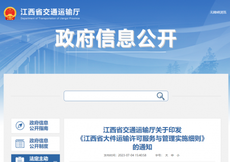 日前,江西省交通运输厅出台《江西省大件运输许可服务与管理实施细则》,进一步加强大件运输许可服务与管理工作。《细则》将于2023年8月1日起正式实施。 江西省大件运输许可服务...