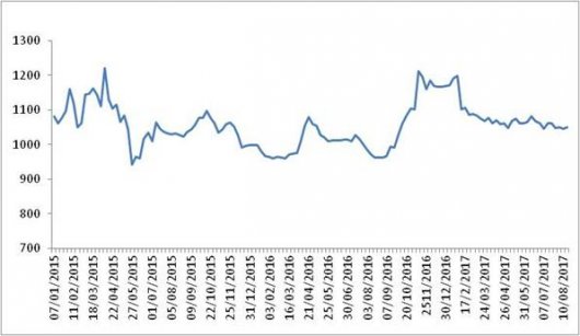 本周(2017年8月14日~8月18日),由中国物流与采购联合会和林安物流集团联合调查的中国公路物流运价指数1049.23点,止跌回升,比上周回升0.41%。 图 1 2015-2017年各周中国公路物流运价指数...