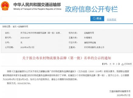 4月17日,交通运输部运输服务司发布公告,对首批拟确定25个农村物流服务品牌予以公示,公示期限为2020年4月17日至4月24日。...