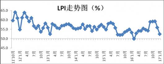 中国物流与采购联合会发布的2017年1月份中国物流业景气指数为52.5%较上月回落3.5个百分点;中国仓储指数为51%,较上月回落1.7个百分点;中国公路物流运价指数为118.8点,比上月回升...