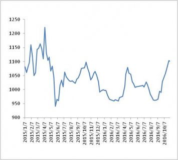 中国物流与采购联合会 本周(2016年10月31日~11月4日),中国公路物流运价指数1101.3点,在连续四周回升后小幅回调,比上周回落0.2%。 图 1 2015-2016年各周中国公路物流运价指数 各车型指...