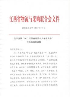 附件:“2017江西省物流十大年度人物”评选申请表.docx 注:请提交申报资料的企业,申请表盖章扫描后,电子版1份发邮箱:ganwulian@jiangxiwuliu.com.cn,纸质版3份邮寄协会。邮寄地址:江...