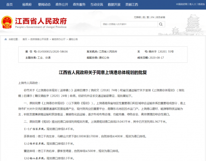 上饶市人民政府: 你市关于《上饶港总体规划(送审稿)》送审的请示(饶府文〔2018〕74号)和省交通运输厅关于呈报《上饶港总体规划》(报批稿)的请示(赣交港航字〔2020〕24号)收悉。经研...