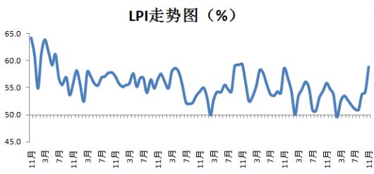 中国物流与采购联合会发布的2019年11月份中国物流业景气指数为58.9%较上月回升4.7个百分点;中国仓储指数为54.4%,较上月回升3.5个百分点。 中国物流信息中心主任何辉认为:11月份,物...
