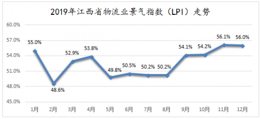 2019 年,江西省物流业景气指数平均值为52.6%,其中上半年平均值为51.8%,下半年平均值为53.5%,显示出全省物流运行相对稳健,年内物流活动虽有所波动,但下半年缓中趋稳、稳中有进...