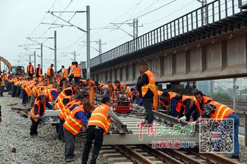 吴朋珊、冯雨山、全媒体记者章娜摄影报道:11月12日16时,经过330分钟的封锁施工,由中铁二十四局承建的南昌西动车运用所动走4线302#道岔插铺封锁施工完成,标志着昌赣高铁引入南...