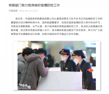 据中国铁路4月12日消息,连日来,中国国家铁路集团有限公司认真贯彻落实习近平总书记对疫情防控工作的重要指示批示精神和党中央、国务院部署要求,自觉在国家疫情防控大局中担...
