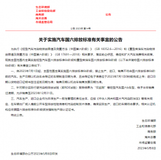 工信部等5部门发布公告:自2023年7月1日起,全国范围全面实施国六排放标准6b阶段, 禁止生产、进口、销售不符合国六排放标准6b阶段的汽车。 生态环境部办公厅2023年5月8日印发关于实...