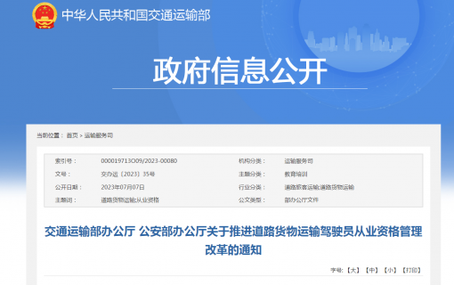 7月7日,交通运输部联合公安部印发了《关于推进道路货物运输驾驶员从业资格管理改革的通知》(简称《通知》),进一步优化完善道路货物运输驾驶员(危险货物运输驾驶员除外)...